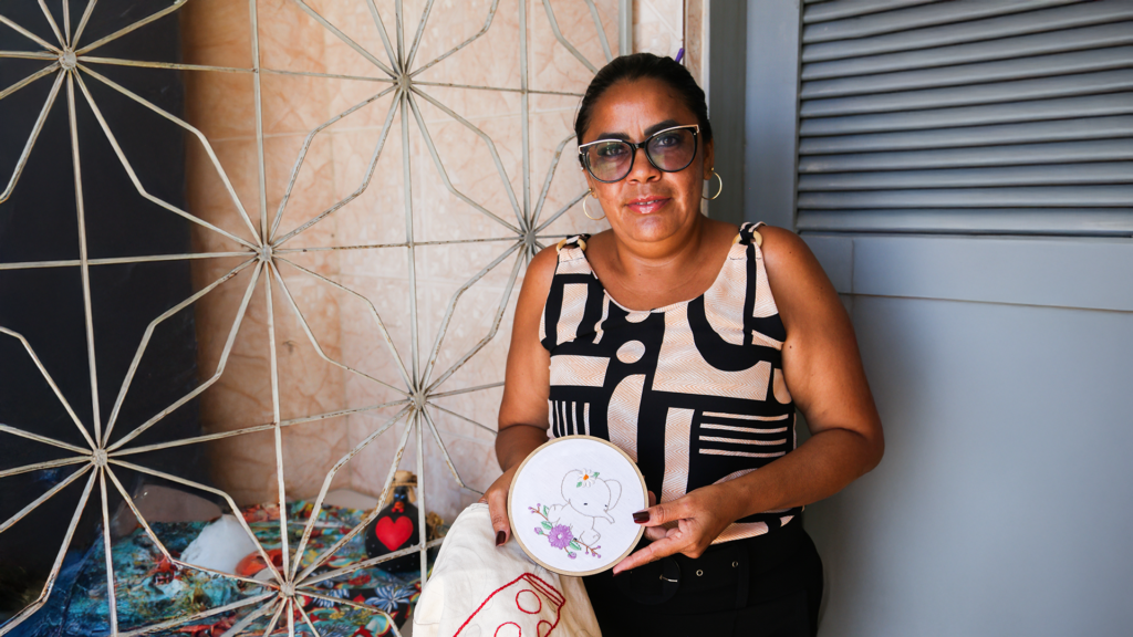A bordadeira Elisângela da Silva participa da associação há quase dois anos. Sem experiência anterior, ela aprendeu a bordar no espaço e hoje se dedica ao bordado livre. “Eu achava que não era capaz. Hoje, cada peça que faço me mostra que eu consigo aprender e produzir”, conta.