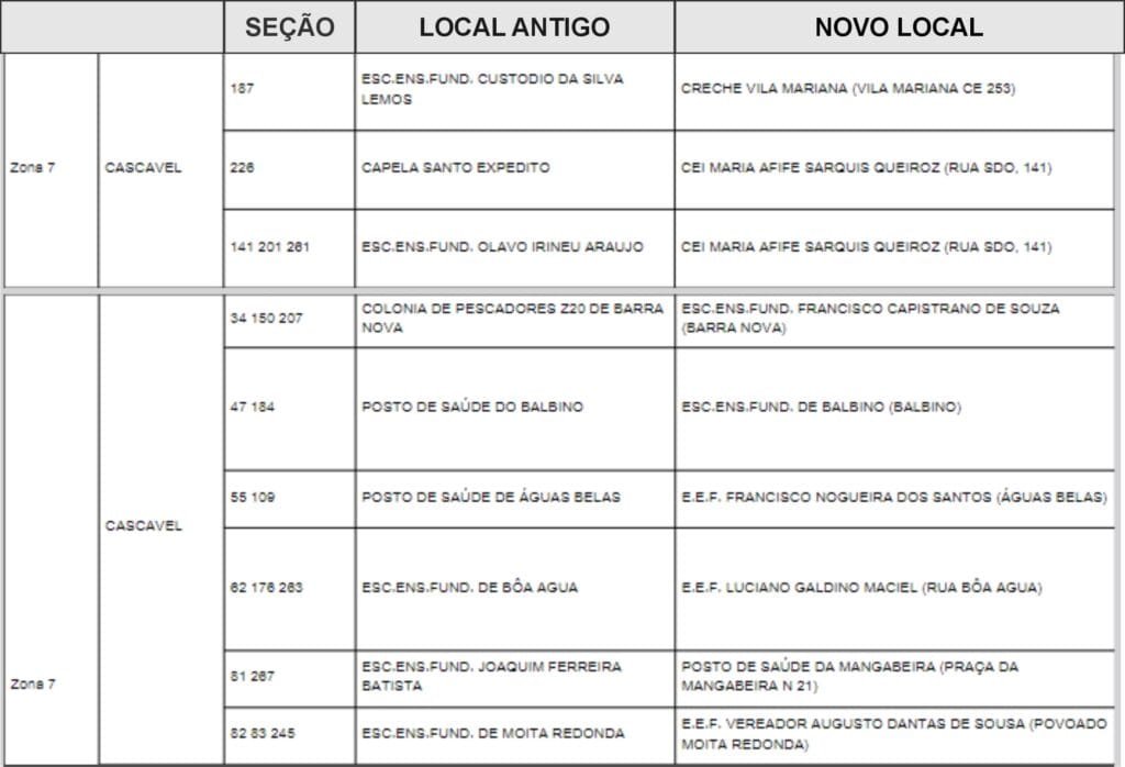 O Tribunal Regional Eleitoral do Ceará (TRE-CE) reforça que a população esteja atenta às atualizações dos locais de votação deste ano. Para as eleições de 2024, o Ceará teve 1.716 seções eleitorais com endereços alterados em vários municípios, entre eles Cascavel.