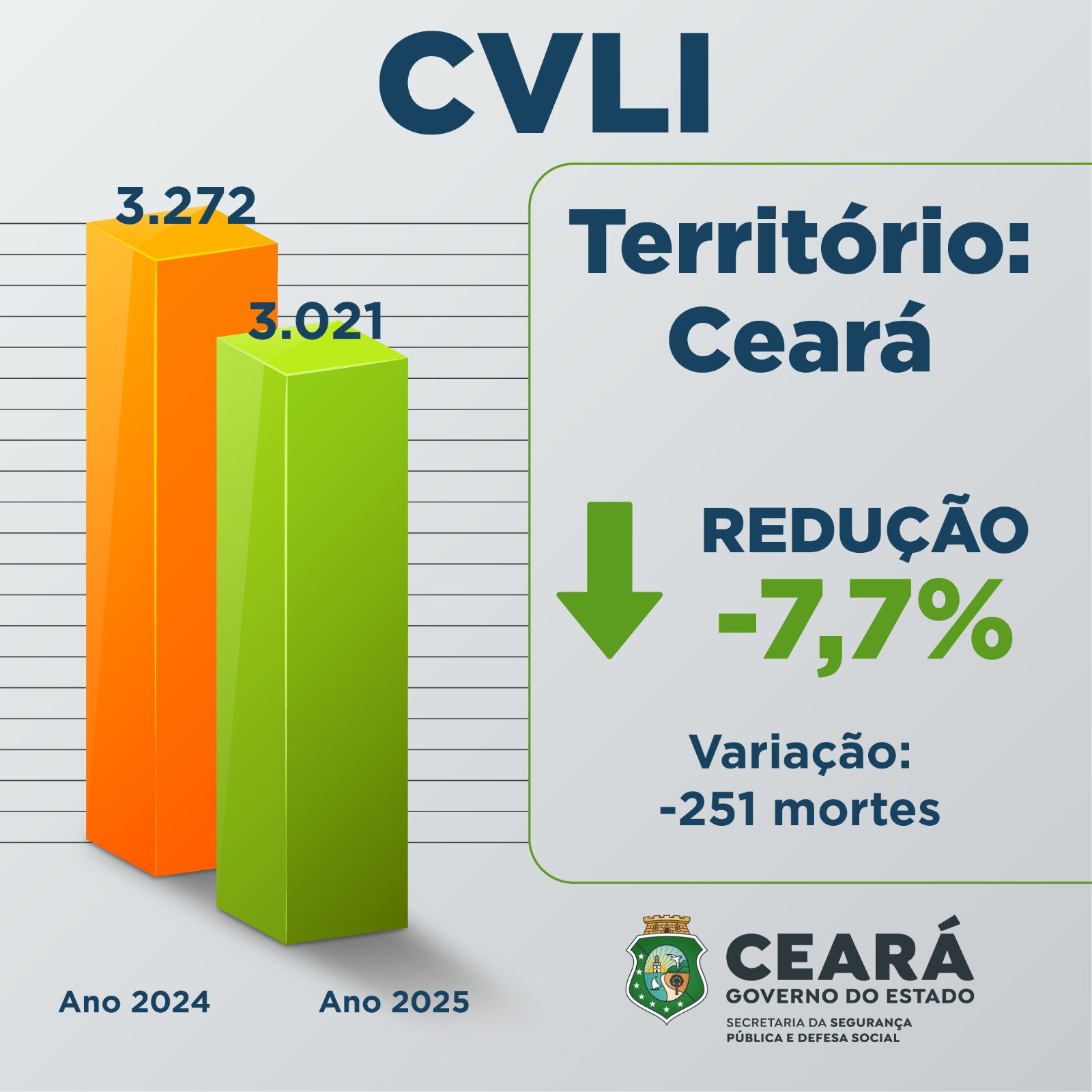 Redução de 7,7% nos Crimes Violentos Letais e Intencionais (CVLI) no Ceará em 2025, com 251 mortes a menos em comparação com 2024, segundo dados oficiais da Secretaria da Segurança Pública e Defesa Social do Ceará (SSPDS).